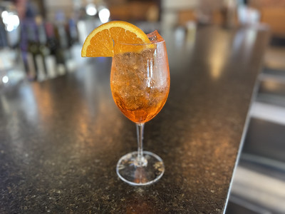 3 Teile Prosecco in ein Glas mit Eiswürfeln gießen, 2 Teile Aperol dazugeben, einen Spritzer Soda hinzufügen, Orangenscheibe ins Glas geben.