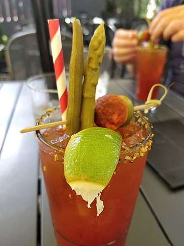 Wodka, Clamato, Tabasco, Tomaten- und Meerrettichsaft und Worcestershiresauce dazu geben.